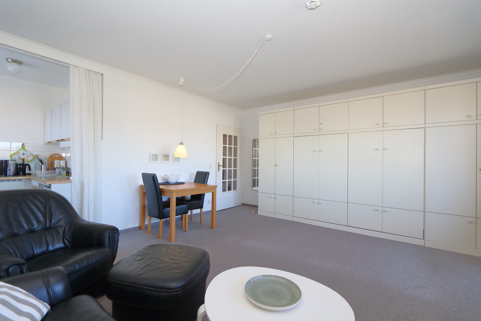 Das Wohnzimmer ist mit Sitzgruppe, Fernseher und Radio ausgestattet. Eine Eßecke für 2 Personen ist integriert, das schicke kleine Duschbad macht schon morgens gute Laune.