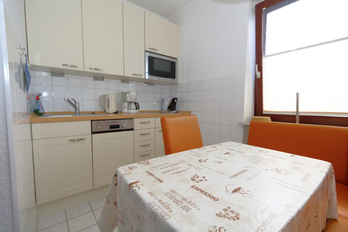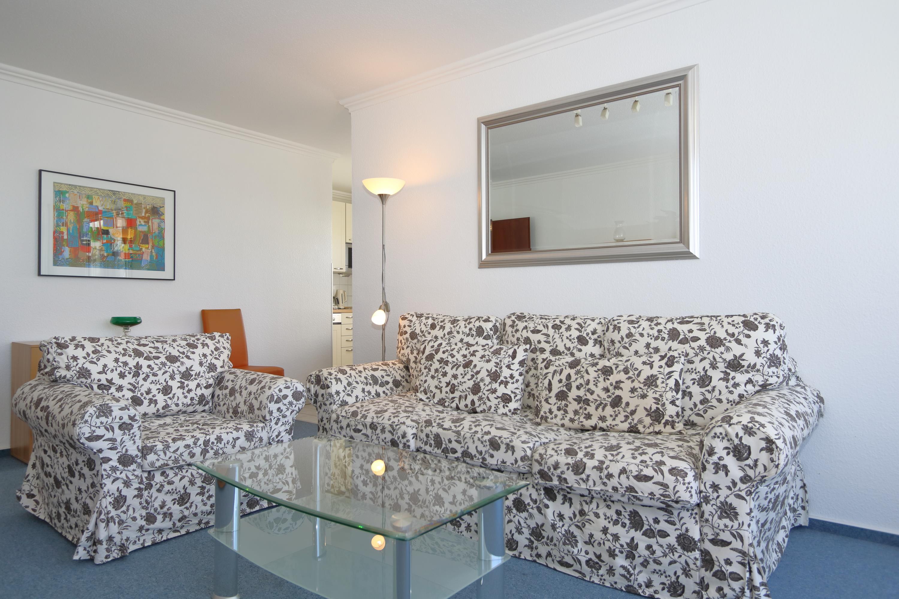 Im Wohnzimmer steht eine große, gemütliche Couch, die sich zu einer bequemen Schlafgelegenheit ausziehen lässt. Vom Wohnzimmer aus offen zugänglich befindet sich die Küchenzeile (mit u. a. Mikrowelle und Spülmaschine) und dem am Fenster stehenden Essplatz. Das Schlafzimmer hat ein Doppelbett (2x90x200cm). Wohnzimmer und Schlafzimmer sind mit Teppichboden ausgelegt. Vor dem Wohnzimmer befindet sich der große Westbalkon mit entsprechenden Balkonmöbeln. Kabel-TV, Telefon und WLan sind vorhanden.