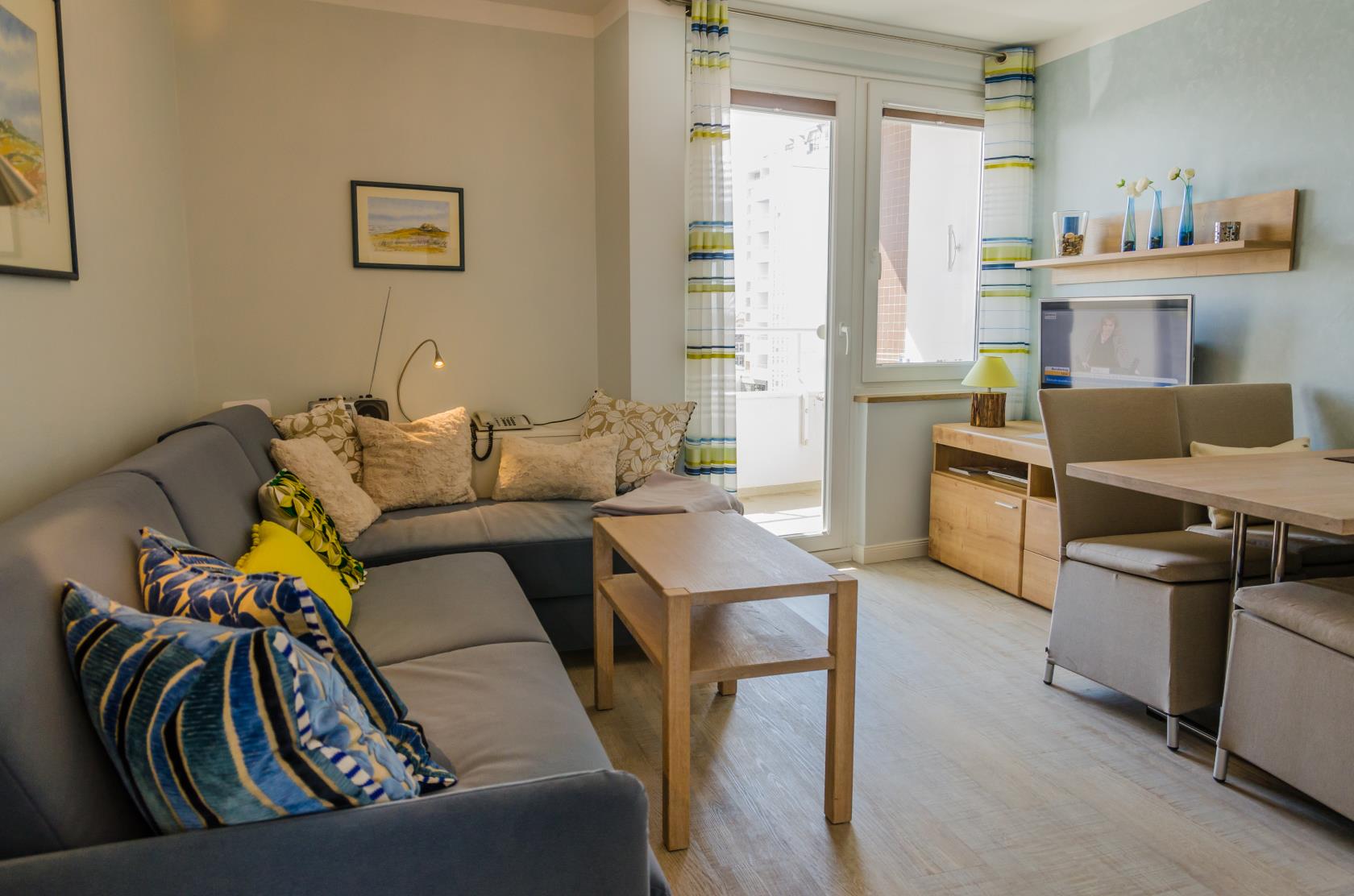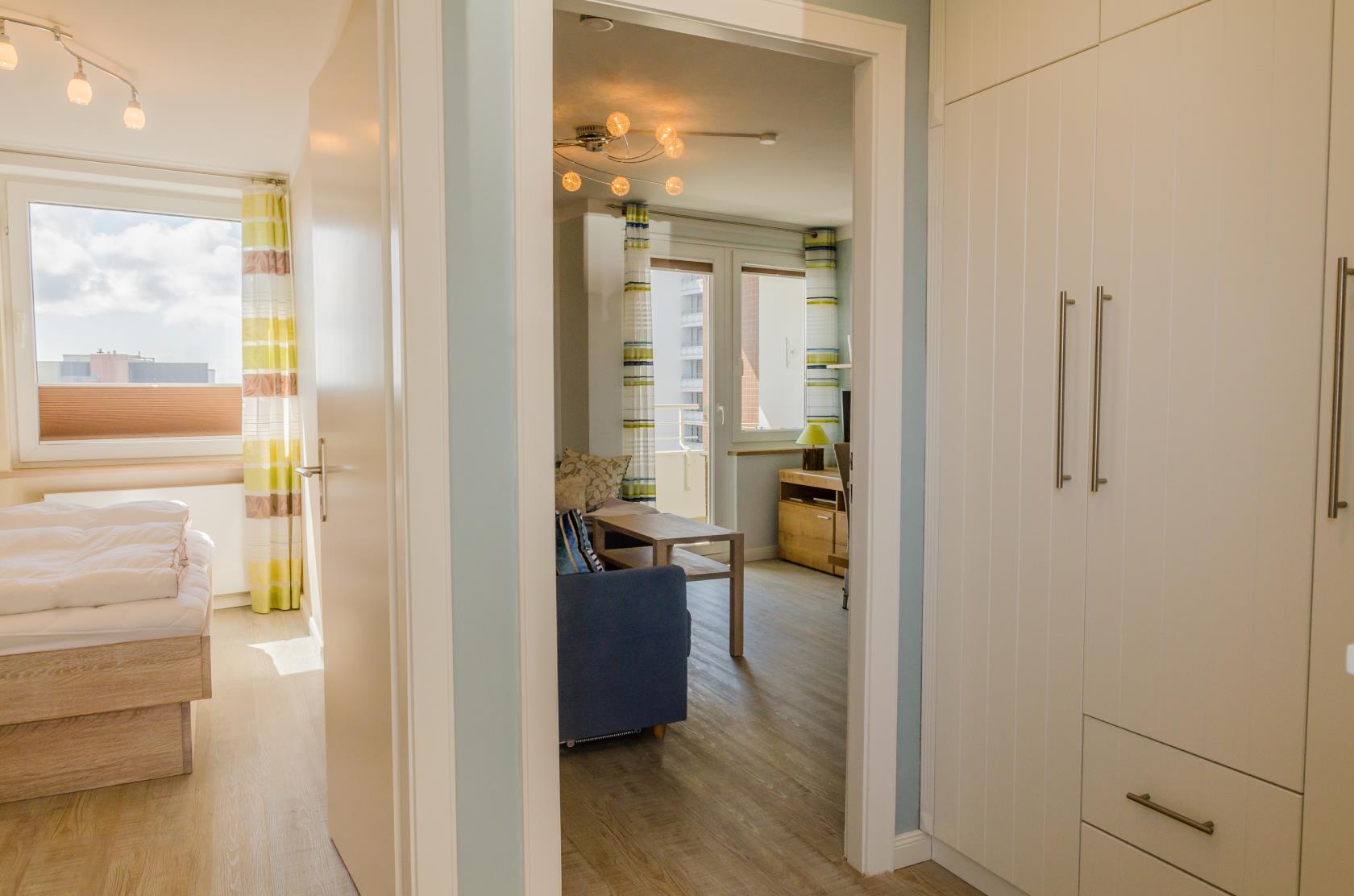 str. 2, gegenüberliegend der "Sylter Welle" in der 6.Etage Die Wohnung ist ca. 40 m² groß und beinhaltet ein Schlafzimmer mit Doppelbett ( 1,80m breit x 1,90 m lang) und einen Einbauschrank. Im Wohnraum gibt es ein neues Schlafsofa für die 3. Person sowie den Essplatz. Die Wohnung ist durchgehend mit einem Designbelag Landhausdiele ausgelegt. Ferner gibt es eine schöne Einbauküche mit Mikrowelle/ Geschirrspüler und ein sep. Duschbad. Ausserdem sind Flachbildschirm TV, DVD-Player, Radio vorhanden. Der Balkon ist nach Süden ausgerichtet. Dies ist eine Nichtraucherwohnung, kleines Haustier ist erlaubt. Dies ist eine ideale Wohnung für den Strandurlaub.