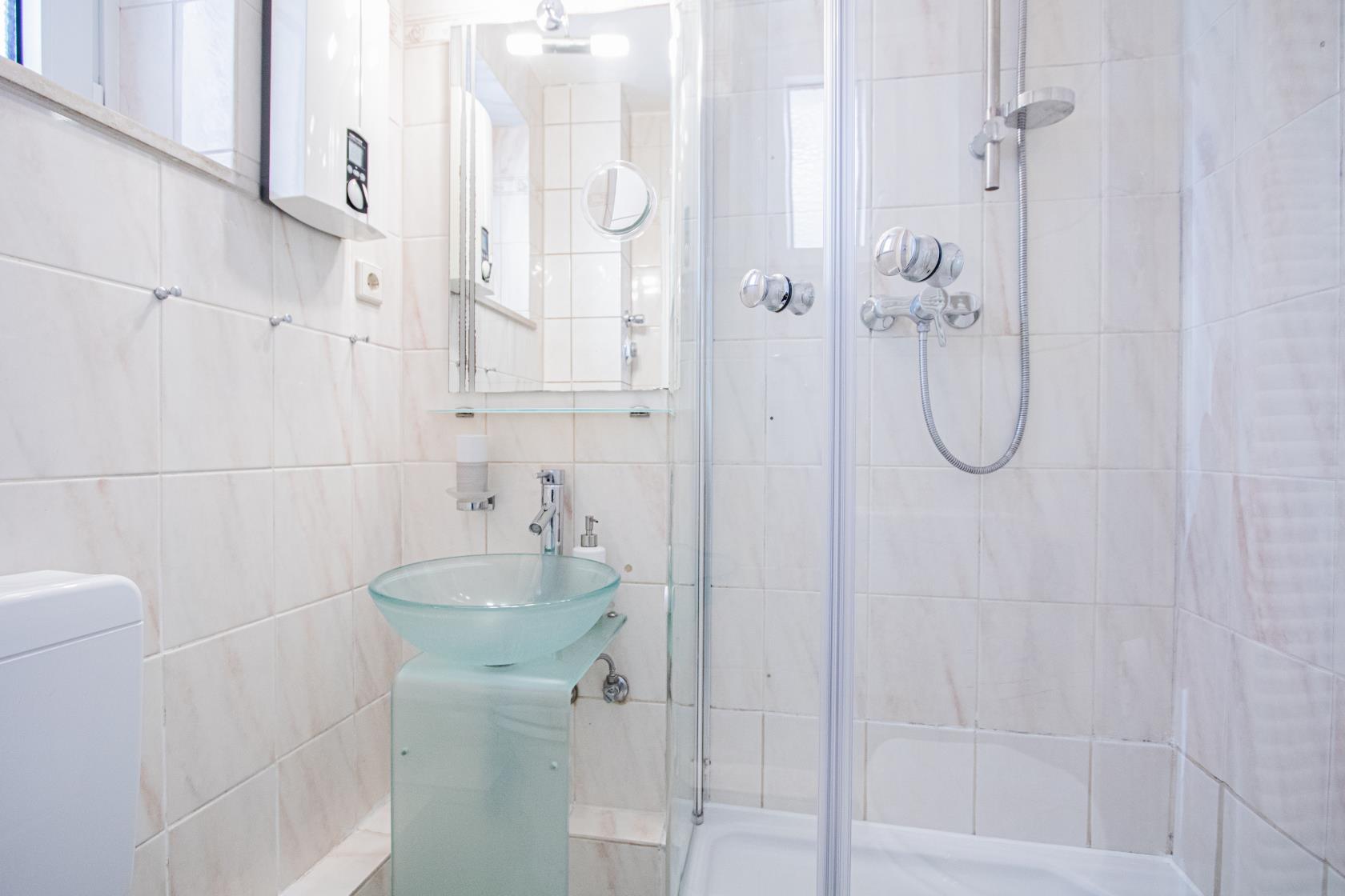 Tageslicht-Badezimmer mit Dusche, WC, Waschtisch.