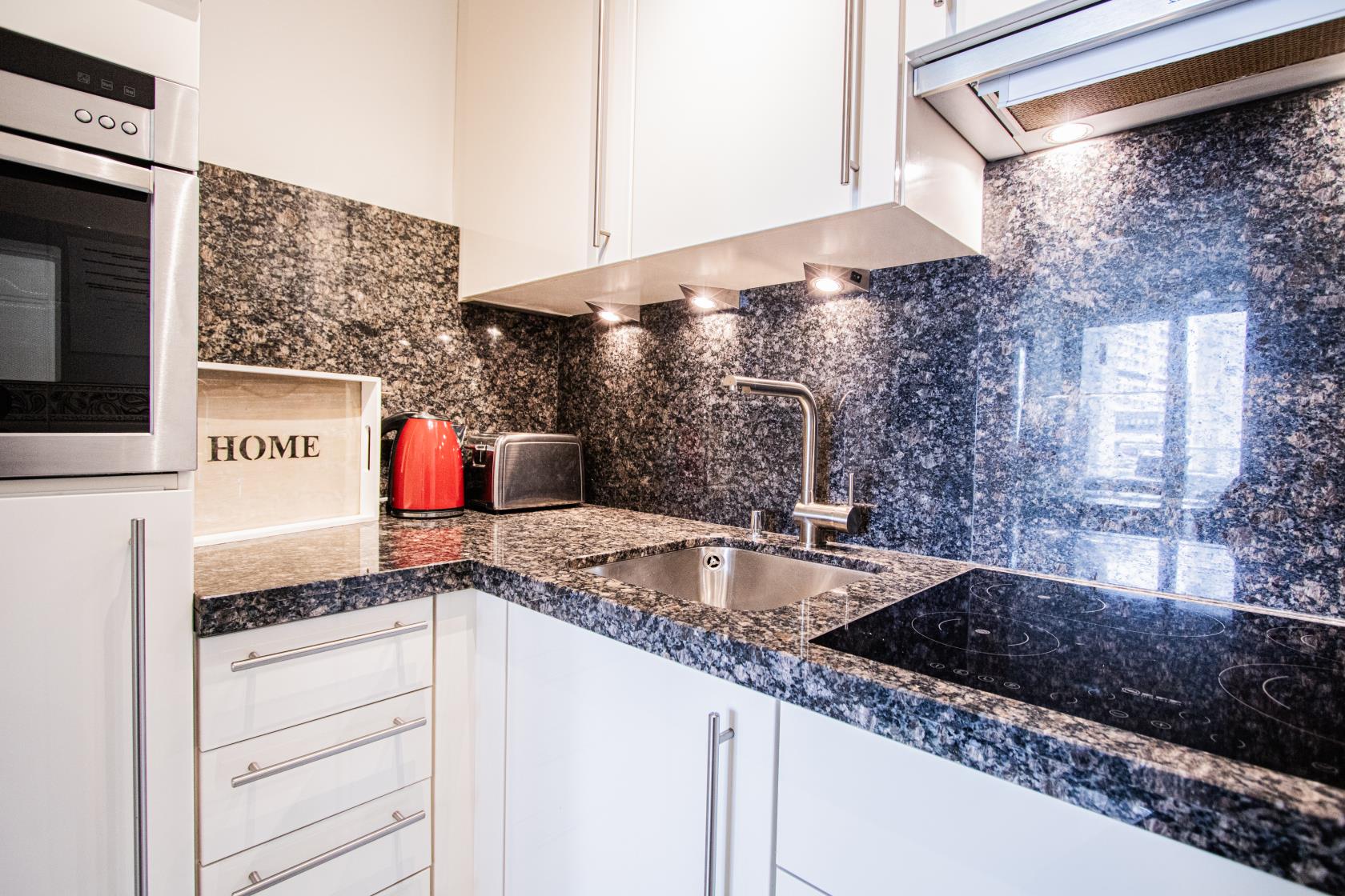 Küche mit Ceran-Kochfeld und Dunstabzug, Backofen, Filter-Kaffeemaschine, elektrischer Wasserkocher und Toaster sind selbstverständlich.