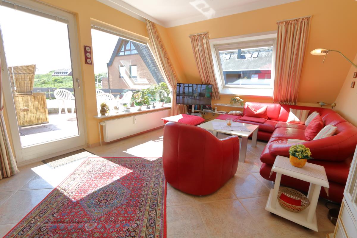 Ein helles Wohnzimmer mit großer Fensterfront zum möblierten Balkon und Dünen mit Sitzecke und Strandkorb. Großer Smart-Tv mit Sat-Anschluß, Eßecke und Couchgarnitur, W'Lan, DVD-Player und Telefon mit Flatrate für das deutsche Festnetz.