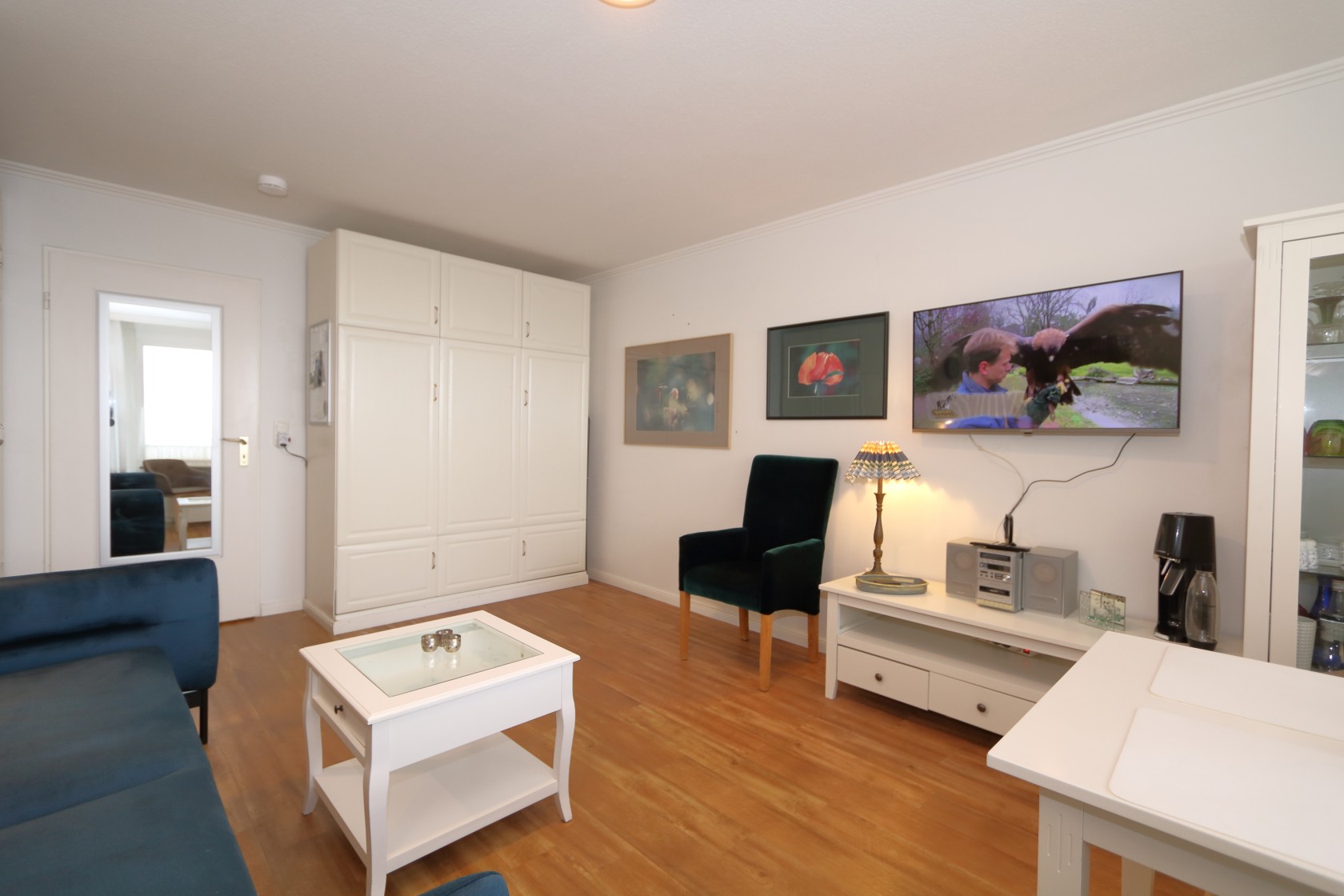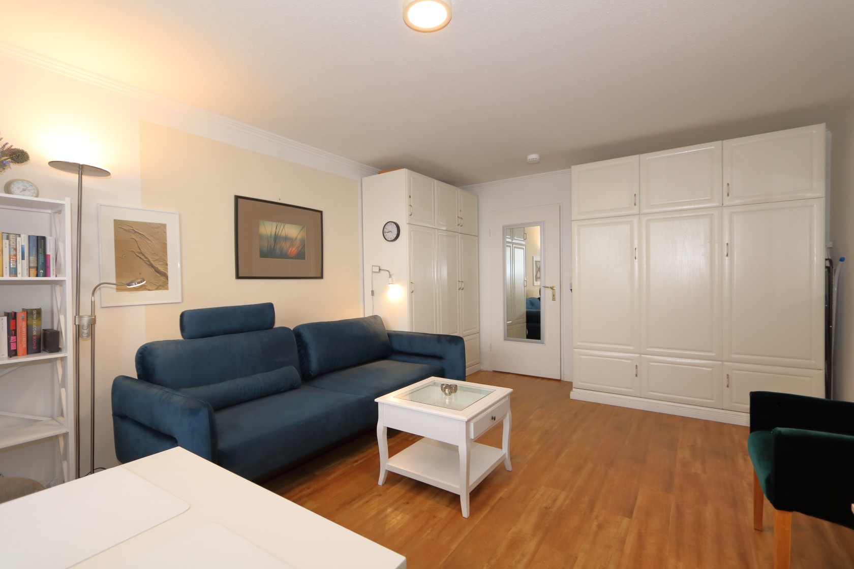 Das Appartement ist großzügig ausgestattet mit u.a. einem festen Boxspringbett, und Westbalkon, moderner Küchenzeile im Flur und ein Badezimmer mit Dusche.