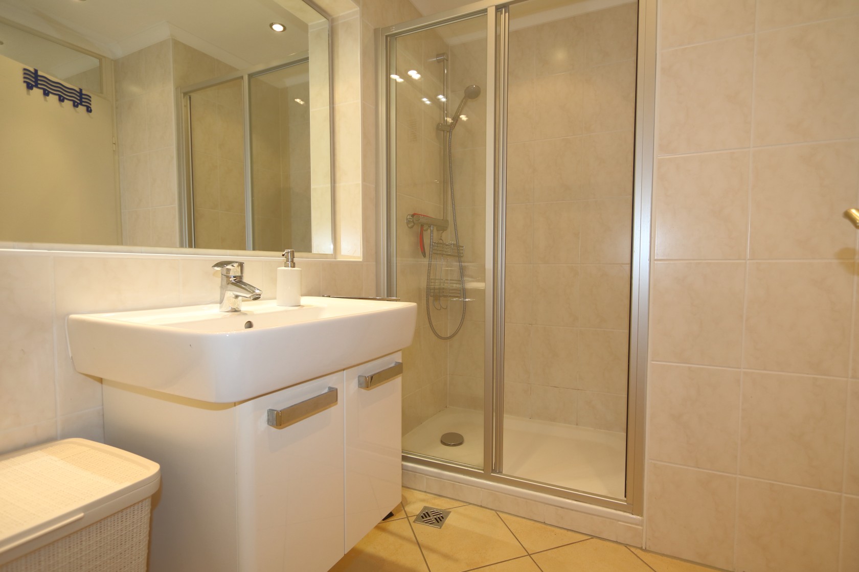 WC, Dusche, Waschbecken, Spiegel und ausreichend Handtücher und Vorleger.