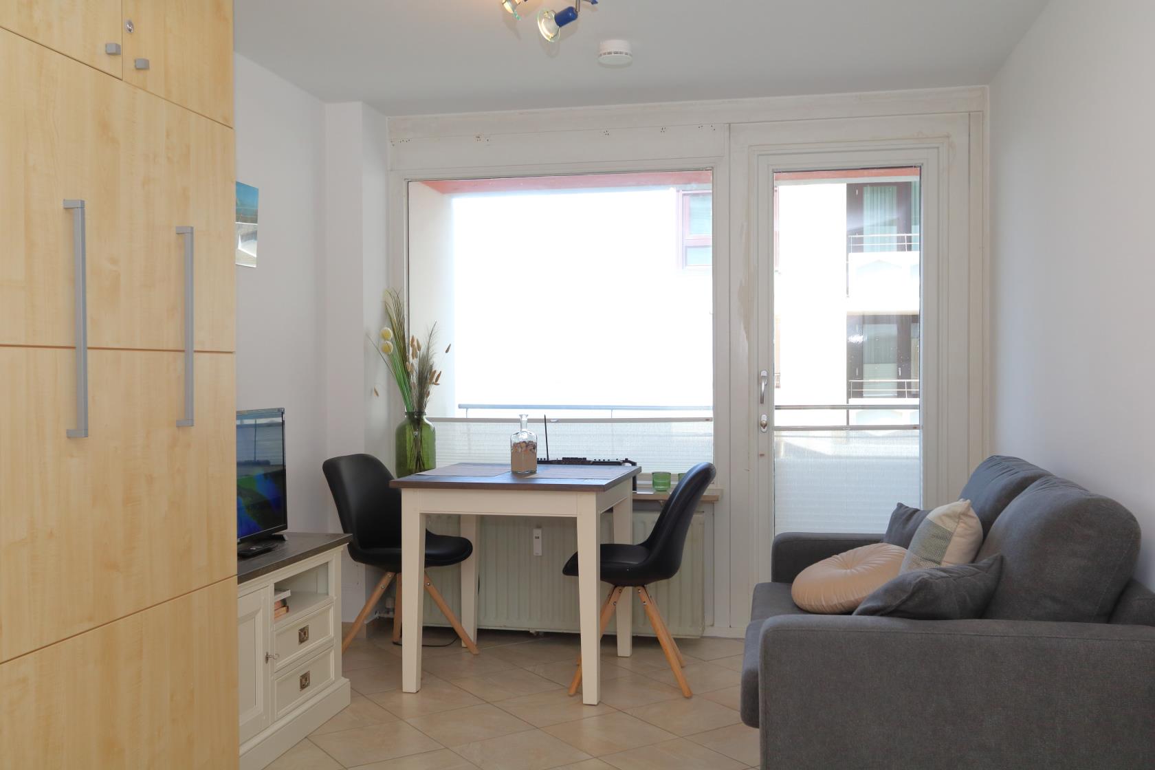 Das Appartement ist ausgestattet mit u.a. einem Schrankbett und Westbalkon, Küchenzeile im Flur und ein Badezimmer mit Dusche.