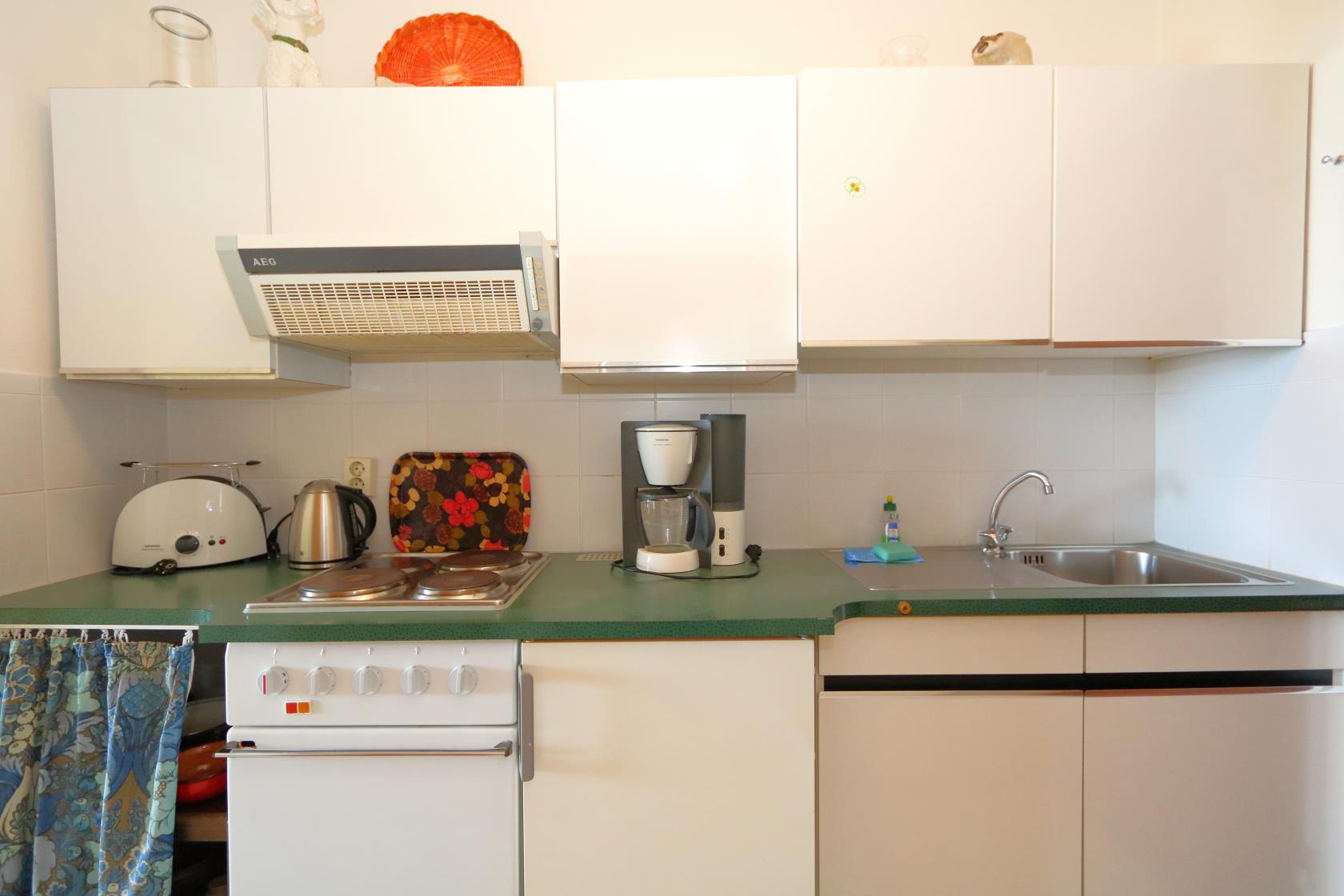 gängige Küchenutensilien, Herd , Dunstabzugshaube, Wasserkocher, Backofen, Filterkaffeemaschine, Toaster, Kühlschrank.