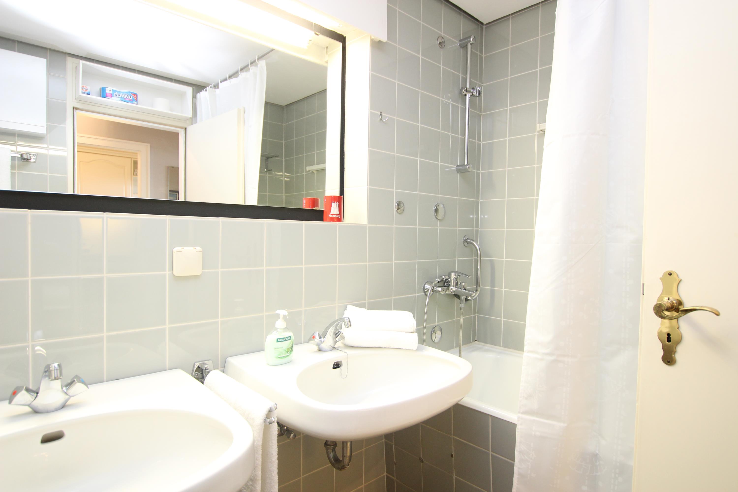 Im Badezimmer befindet sich ein Föhn und zwei separate Waschbecken, zudem gibt es mehrere Handtuchhalterungen und eine Duschwanne mit Vorhang.
