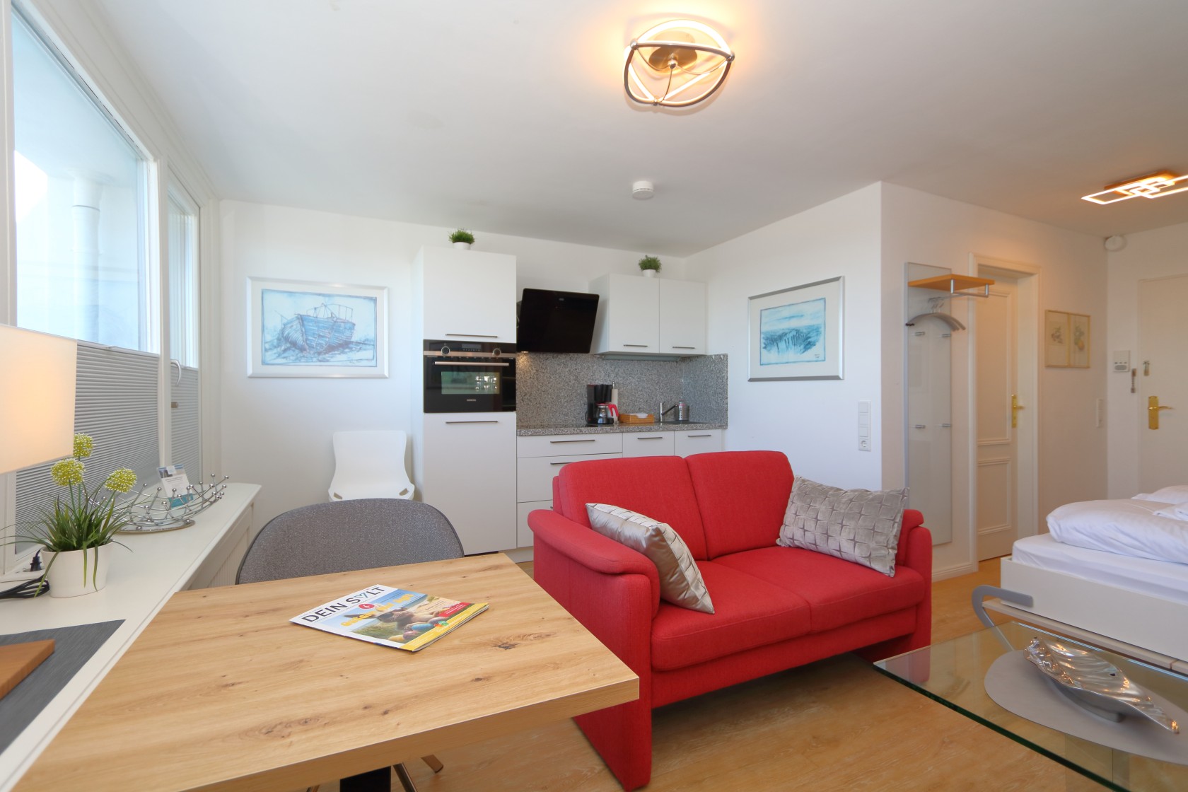 Durch die Glastür, die die Räume abtrennt, kommen Sie in den Wohn-und Schlafbereich, der kreativ eingerichtet ist.