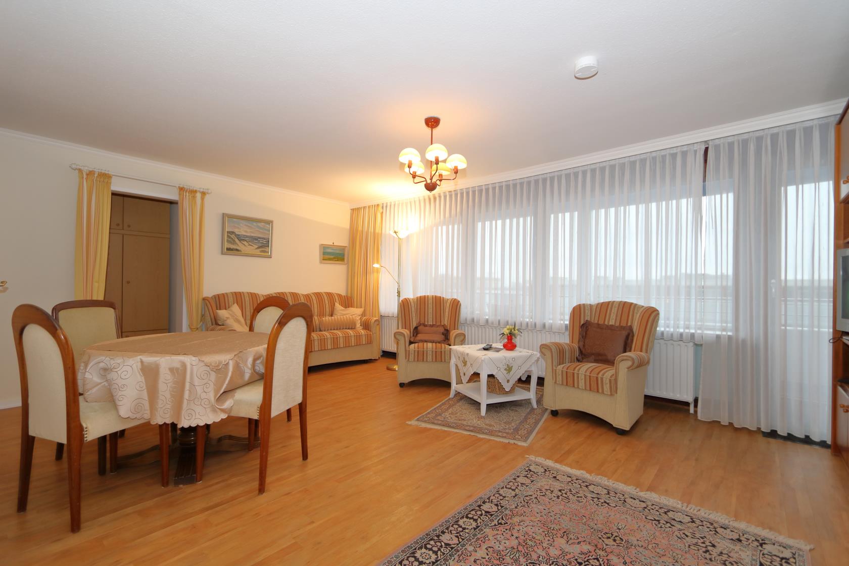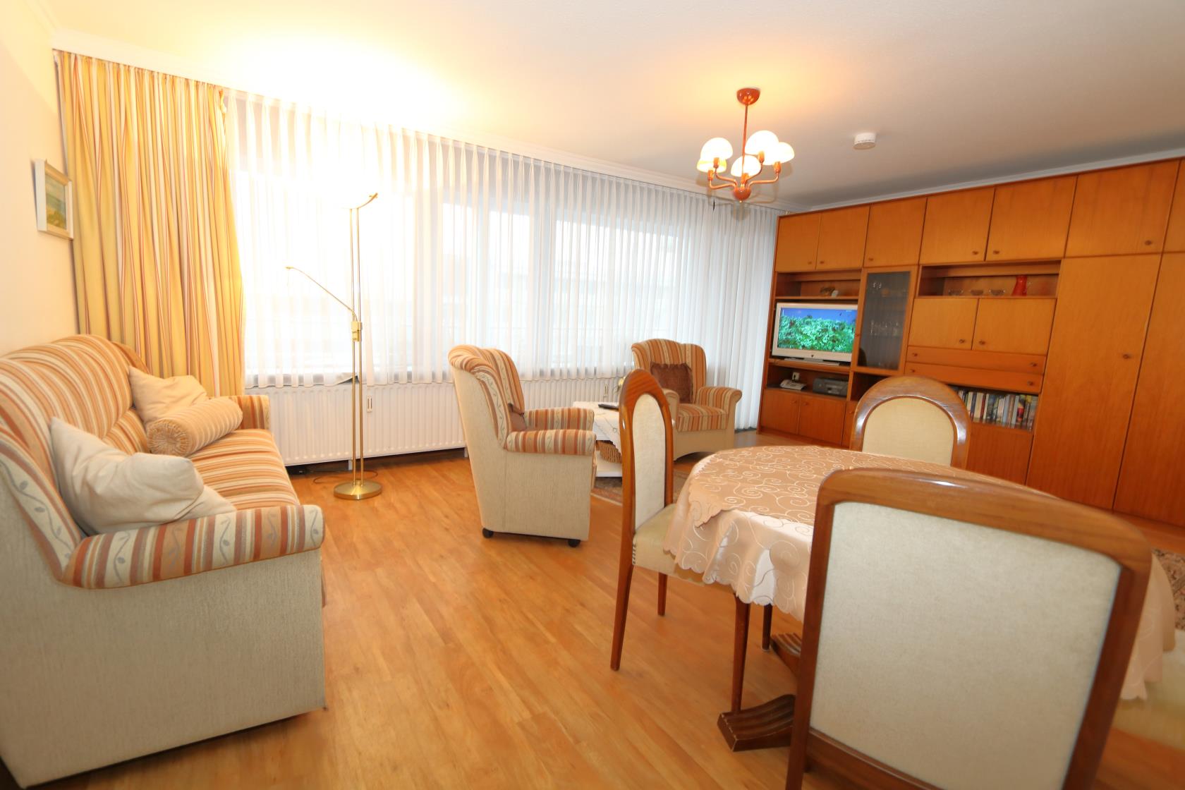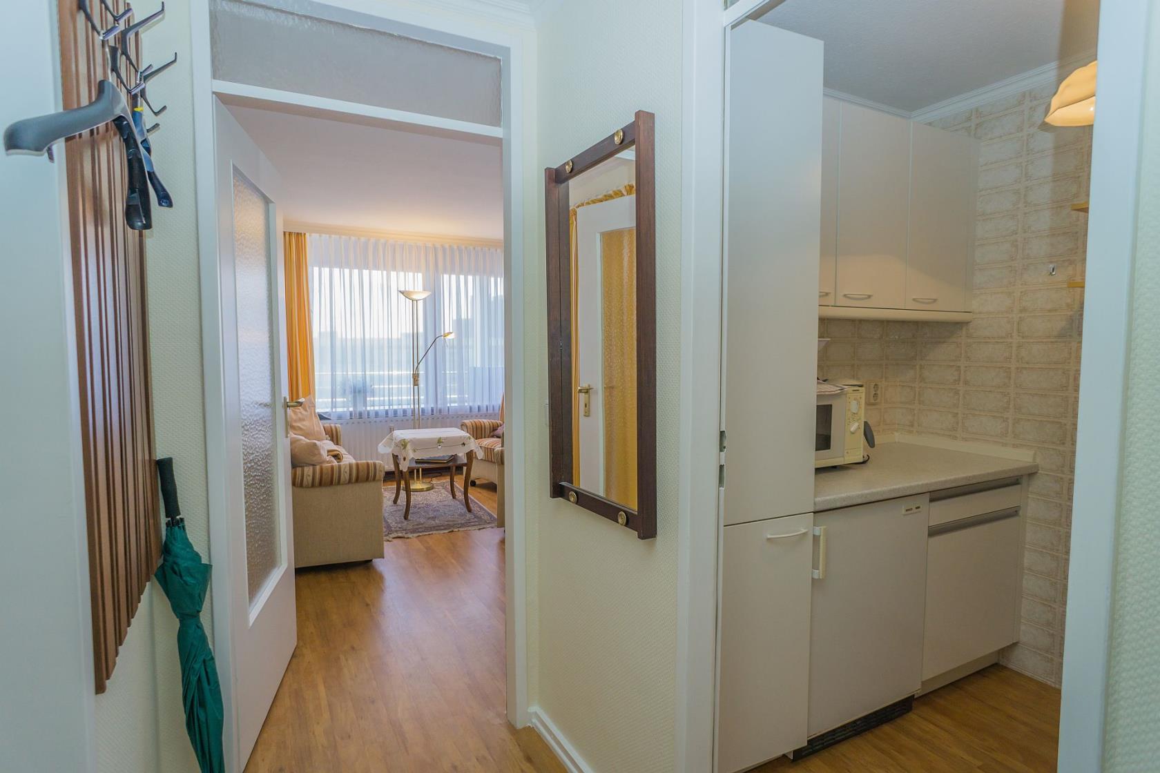 Dieses geräumige Appartement befindet sich im Neuen Kurzentrum im Haus "Sylter Welle". Die Eckwohnung liegt nach Süd-Osten raus mit Blick über die Westerländer Innenstadt und verfügt über zwei Balkone. Das App. ist ca. 50 m² groß und beinhaltet einen Wohn-/Schlafraum mit einem feststehenden, Boxspringdoppelbett, Größe ca. 180 x 200 ) sowie Essplatz für 4 Personen. Das Sofa wäre noch ausklappbar für die 3.te Person. Flachbildschirm und Radio sind vorhanden. Im Haus gibt es ein freies WLAN Netz, welches mit genutzt werden kann. Das große Bad beinhaltet WC/ Dusche großes Waschbecken. Die kleinen EBK hat 4 Plattenherd sowie eine Mikrowelle. Die Wohnung hat einen Design-Vinyl-Bodenbelag in Holzoptik. Hier ist keine Tierhaltung gestattet.