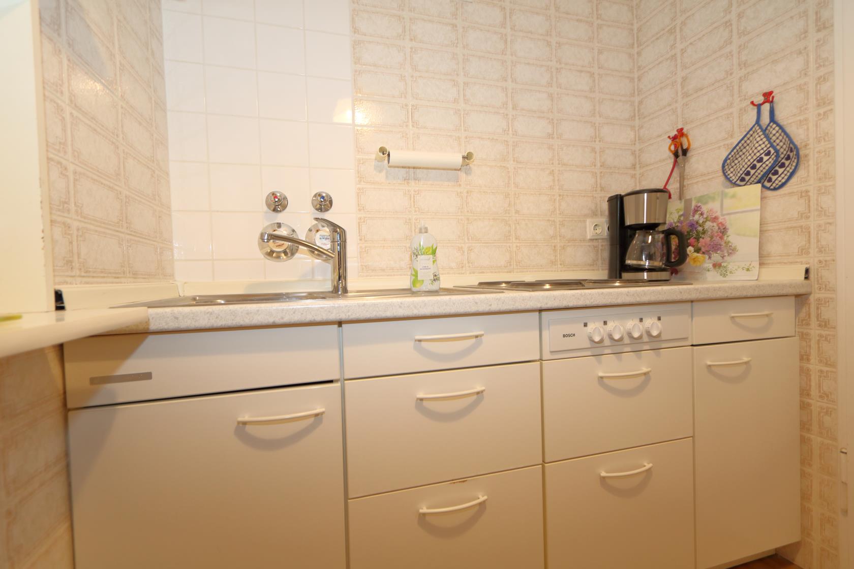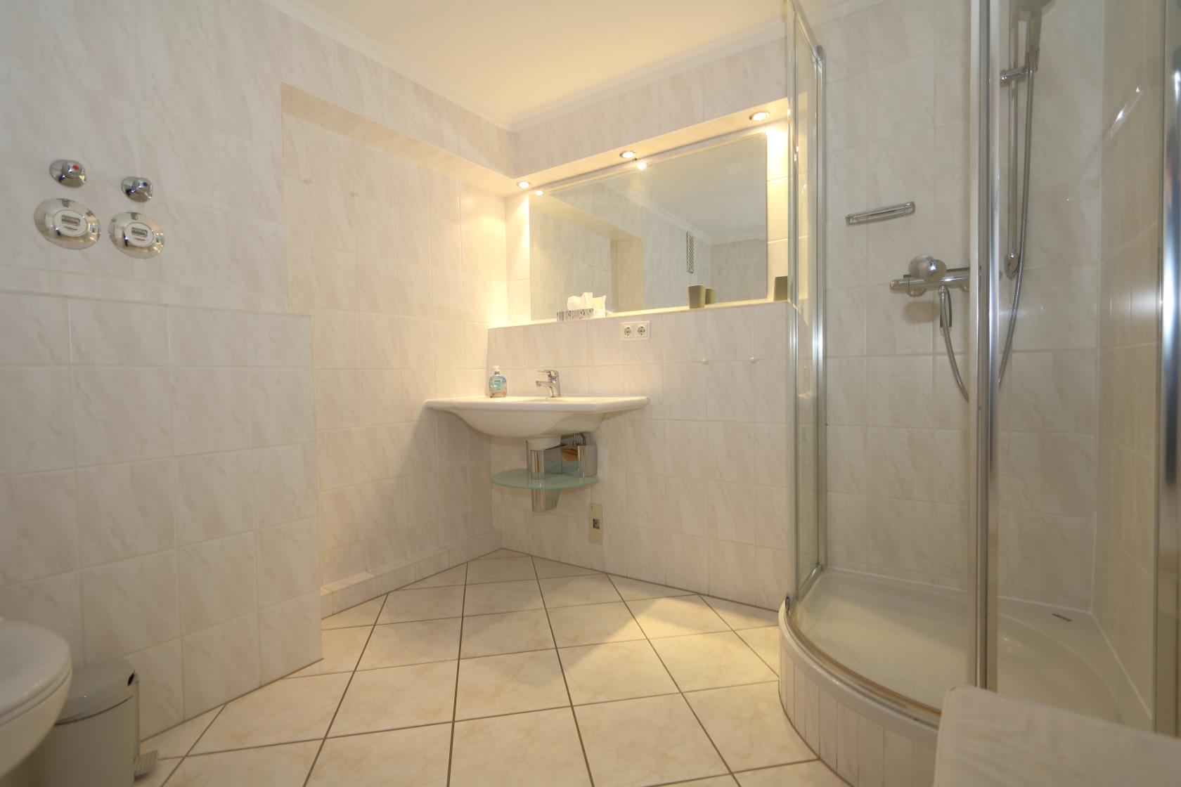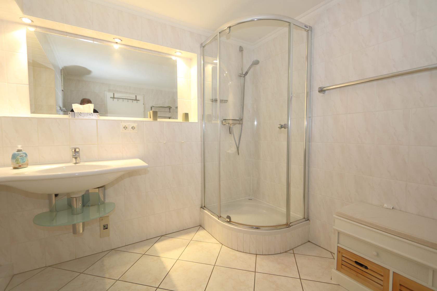 Dieses geräumige Appartement befindet sich im Neuen Kurzentrum im Haus "Sylter Welle". Die Eckwohnung liegt nach Süd-Osten raus mit Blick über die Westerländer Innenstadt und verfügt über zwei Balkone. Das App. ist ca. 50 m² groß und beinhaltet einen Wohn-/Schlafraum mit einem feststehenden, Boxspringdoppelbett, Größe ca. 180 x 200 ) sowie Essplatz für 4 Personen. Das Sofa wäre noch ausklappbar für die 3.te Person. Flachbildschirm und Radio sind vorhanden. Im Haus gibt es ein freies WLAN Netz, welches mit genutzt werden kann. Das große Bad beinhaltet WC/ Dusche großes Waschbecken. Die kleinen EBK hat 4 Plattenherd sowie eine Mikrowelle. Die Wohnung hat einen Design-Vinyl-Bodenbelag in Holzoptik. Hier ist keine Tierhaltung gestattet.