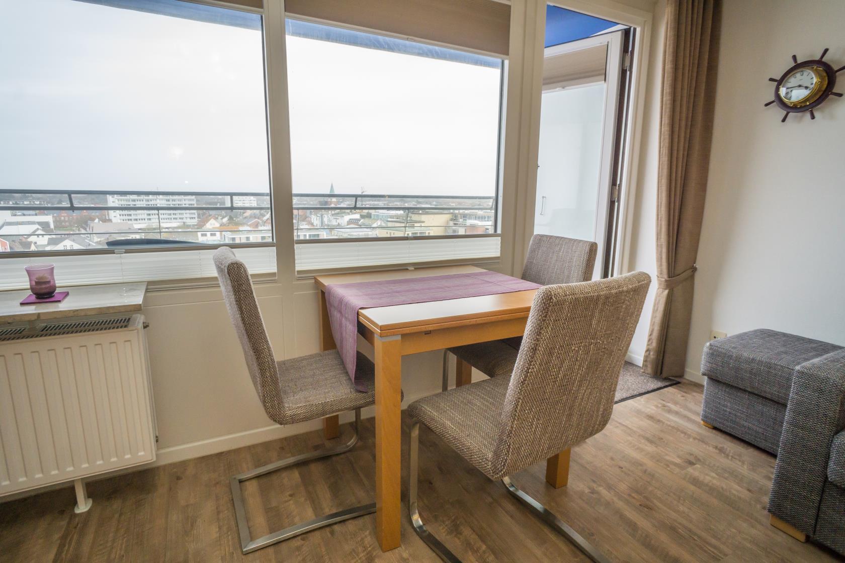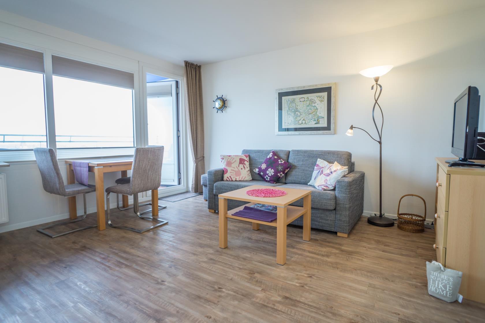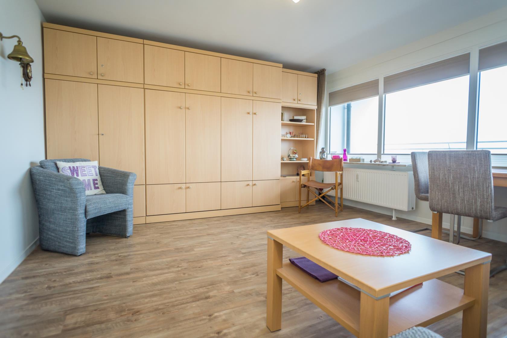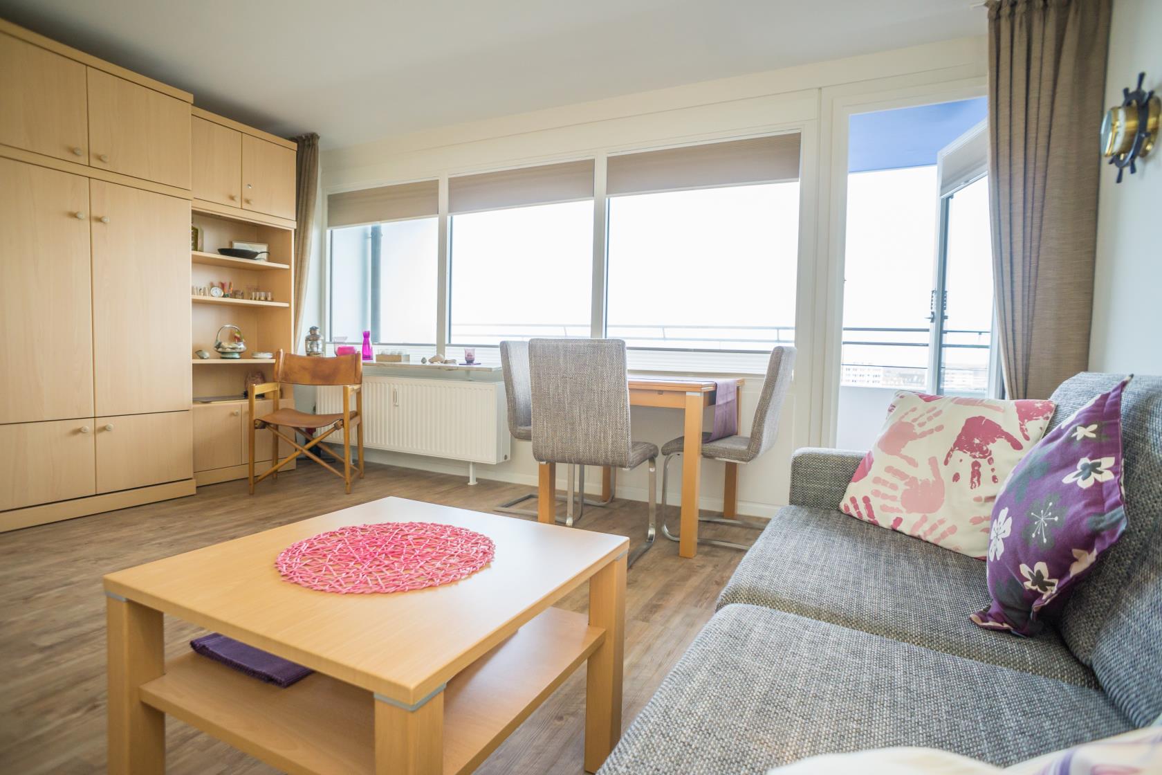 Das App. 85 befindet sich im Haus "Sylter Welle" zur Landseite im Neuen Kurzentrum, Andreas-Dirkstr. 2, in der 8. Etage. Die Wohnung ist insgesamt ca. 40m² groß und beinhaltet einen Wohn/Schlafraum mit mit DoppelSchrankbett (Einzelmatratzen) , Sofaecke sowie einem Eßplatz am Fenster, von wo aus Sie eine tolle Aussicht über die Innenstadt von Westerland geniessen können. Ferner hat die Wohnung eine moderne sep.Einbauküche mit Mikrowelle. Das Wannenbad mit Duschvorrichtung bietet genügend Platz. Die Wohnung ist gemütlich für 2 Personen ausgestattet. Ferner sind Stereoanlage sowie Flachbildschirm vorhanden. Im Haus kann en freies WLAN Netz genutzt werden. Hier sind keine Tiere gestattet, Nichtraucher-Wohnung. . Die Kureinrichtungen/Schwimmbad "Sylter Welle" , die Strandübergänge zur Musikmuschel/ Promenade befinden sich gleich um die Ecke, ideale Lage für Ihren Strandurlaub!