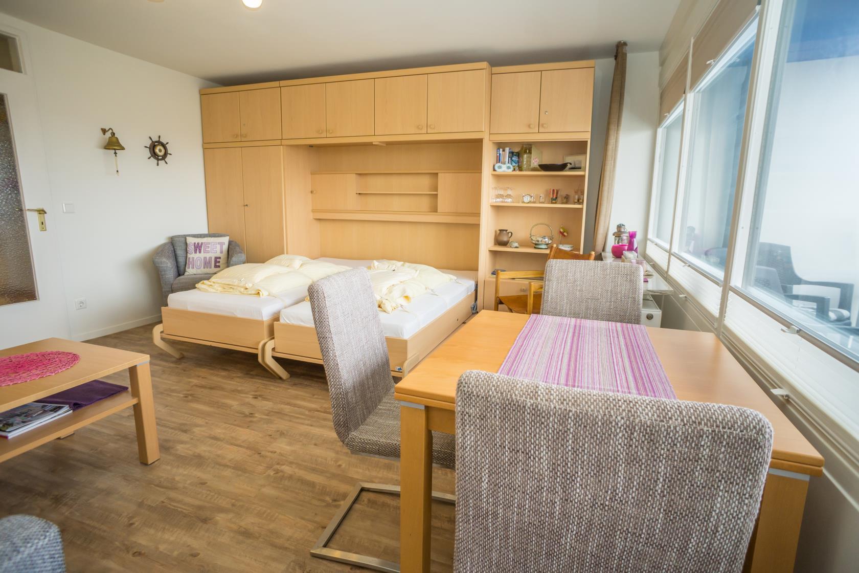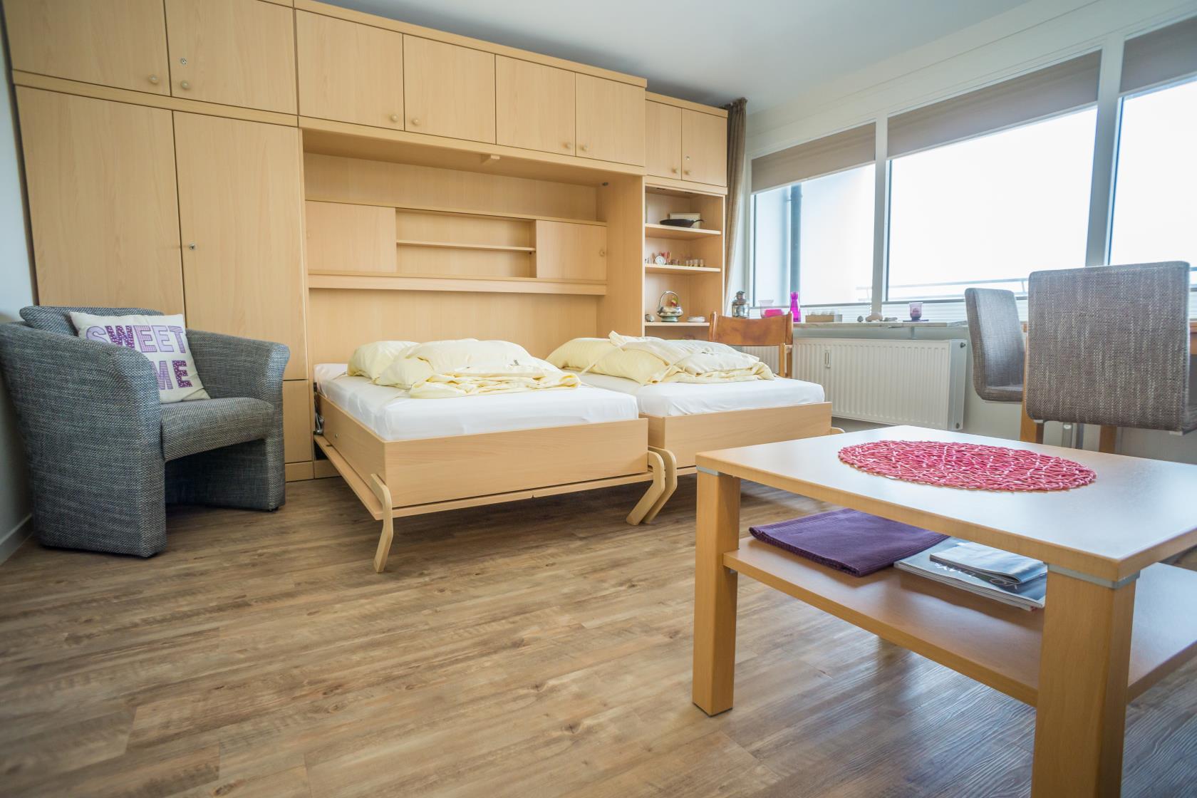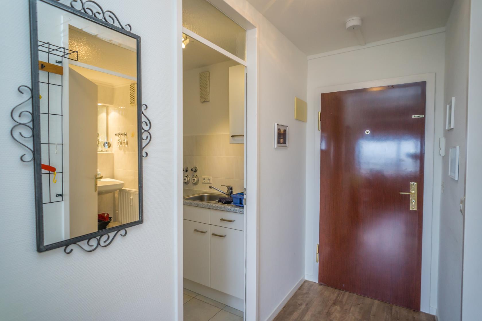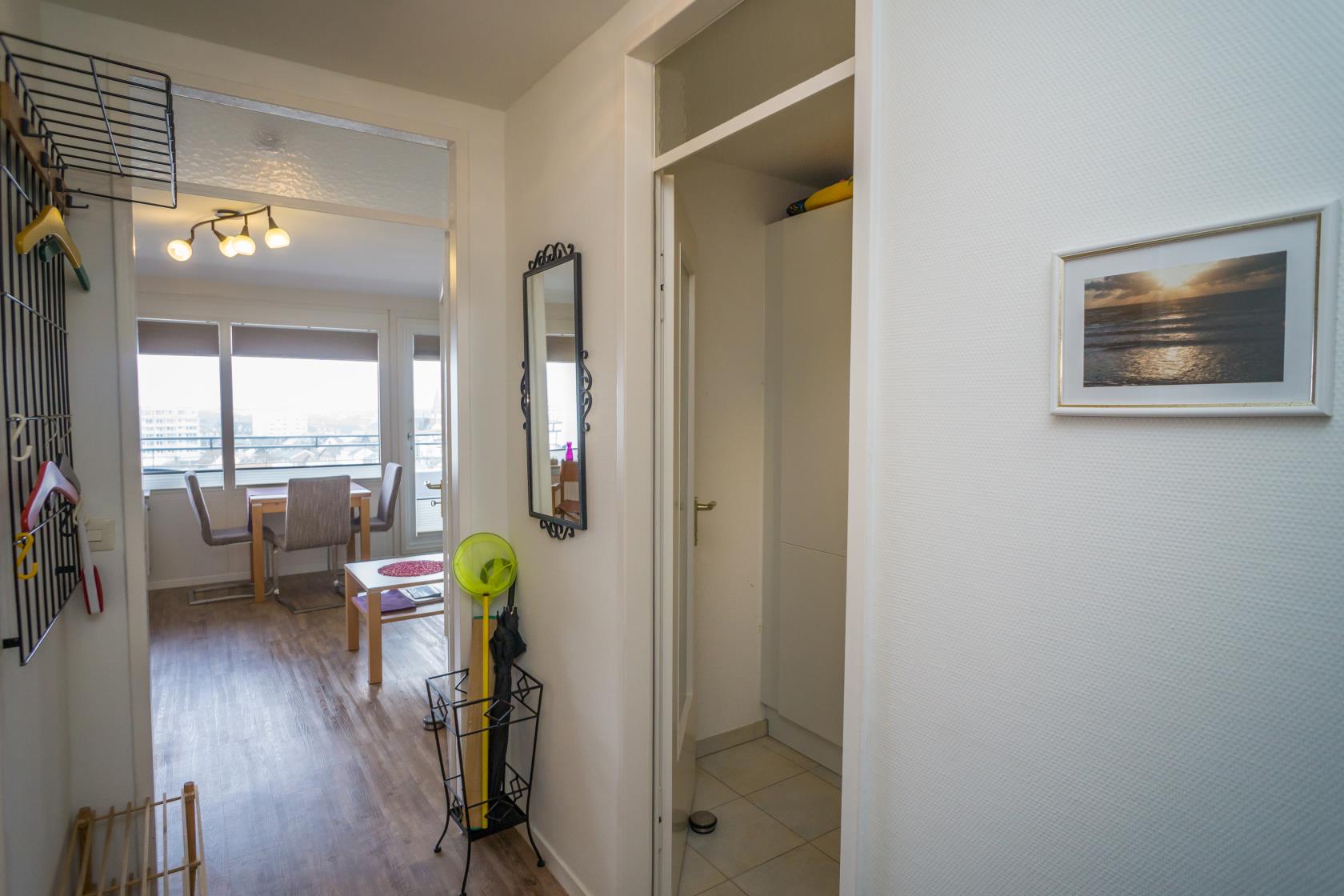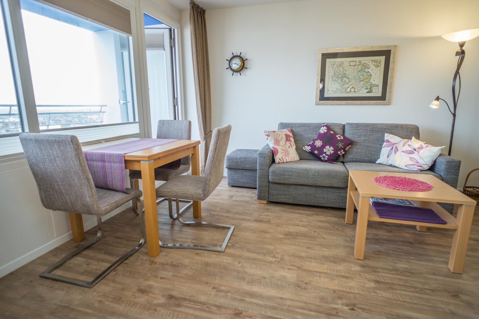 Das App. 85 befindet sich im Haus "Sylter Welle" zur Landseite im Neuen Kurzentrum, Andreas-Dirkstr. 2, in der 8. Etage. Die Wohnung ist insgesamt ca. 40m² groß und beinhaltet einen Wohn/Schlafraum mit mit DoppelSchrankbett (Einzelmatratzen) , Sofaecke sowie einem Eßplatz am Fenster, von wo aus Sie eine tolle Aussicht über die Innenstadt von Westerland geniessen können. Ferner hat die Wohnung eine moderne sep.Einbauküche mit Mikrowelle. Das Wannenbad mit Duschvorrichtung bietet genügend Platz. Die Wohnung ist gemütlich für 2 Personen ausgestattet. Ferner sind Stereoanlage sowie Flachbildschirm vorhanden. Im Haus kann en freies WLAN Netz genutzt werden. Hier sind keine Tiere gestattet, Nichtraucher-Wohnung. . Die Kureinrichtungen/Schwimmbad "Sylter Welle" , die Strandübergänge zur Musikmuschel/ Promenade befinden sich gleich um die Ecke, ideale Lage für Ihren Strandurlaub!