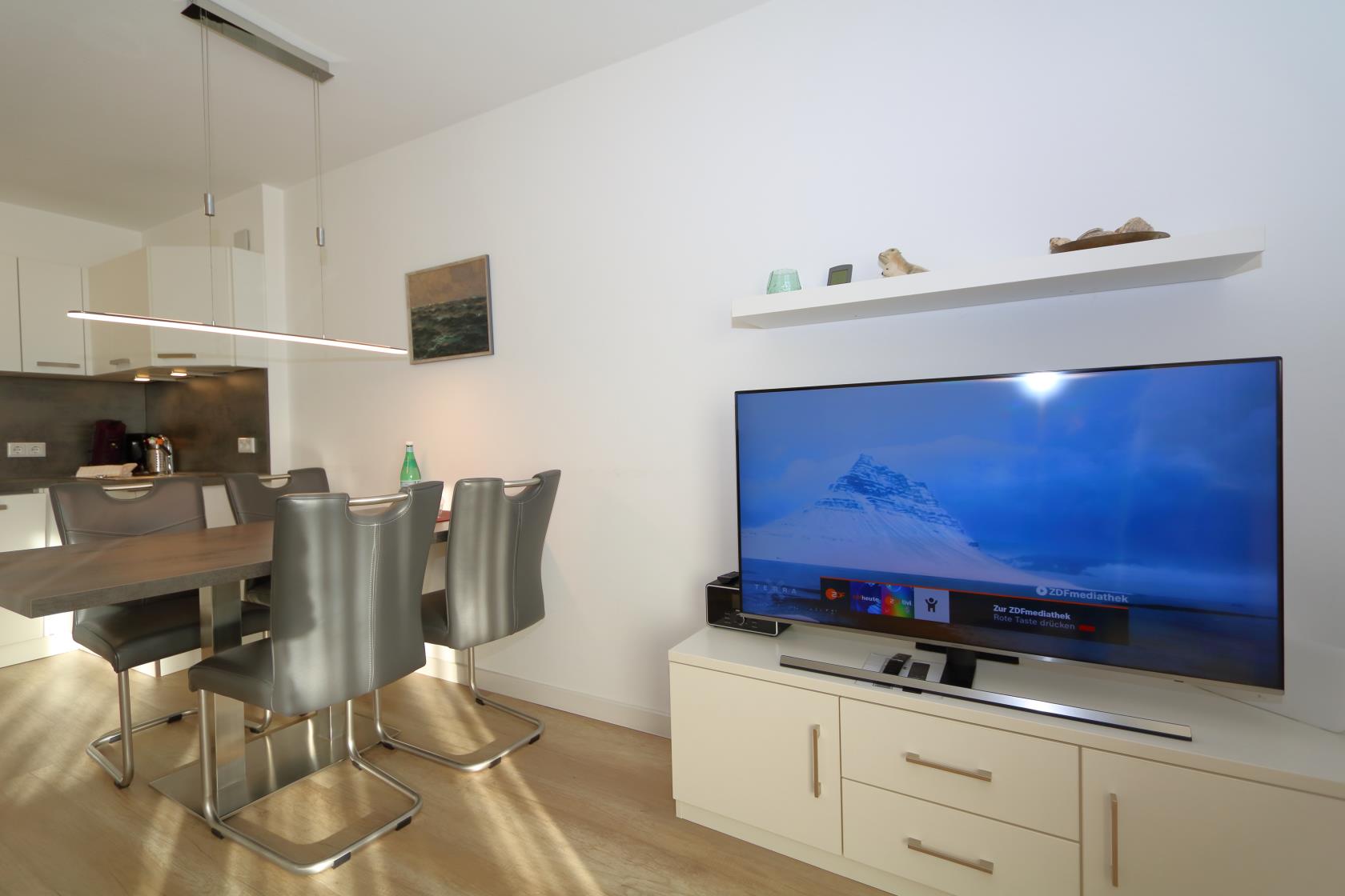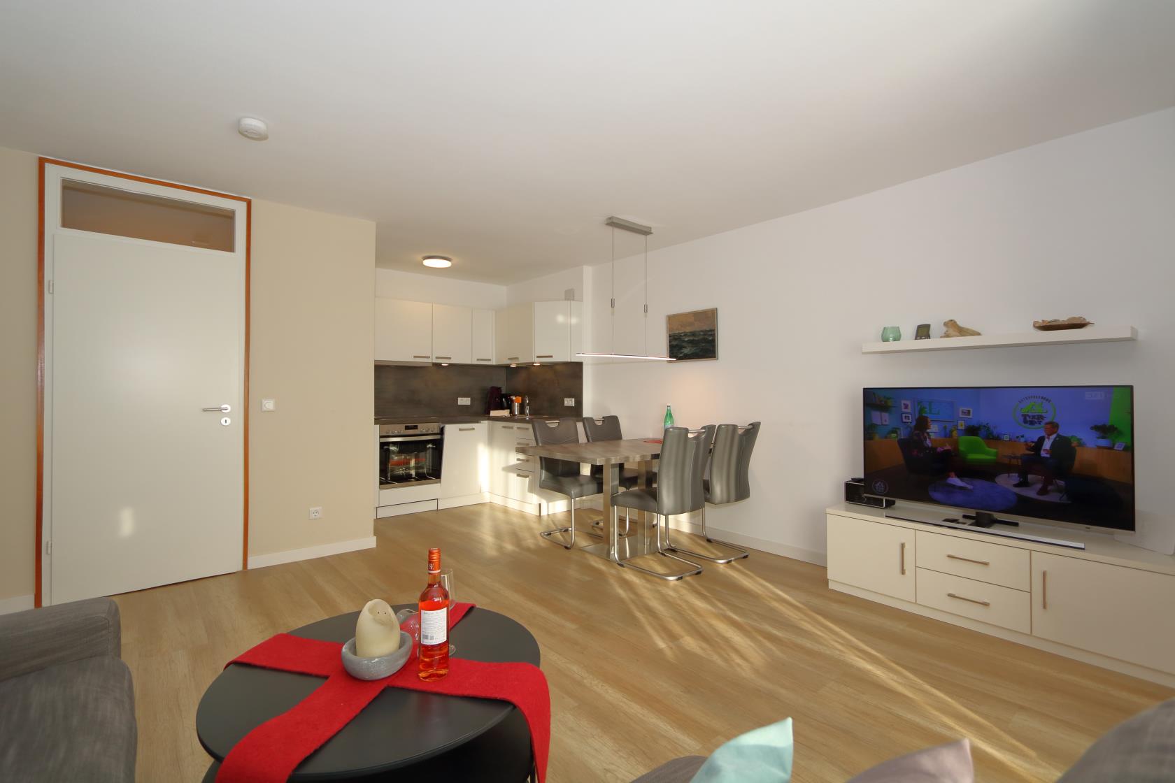 Ein großzügiger Einrichtungsstiel in hellen Farben erwartet Sie. Bequeme Sitzgarnitur, Flachbildfernseher und Radio, W'Lan sowie Eßecke am Küchentresen.