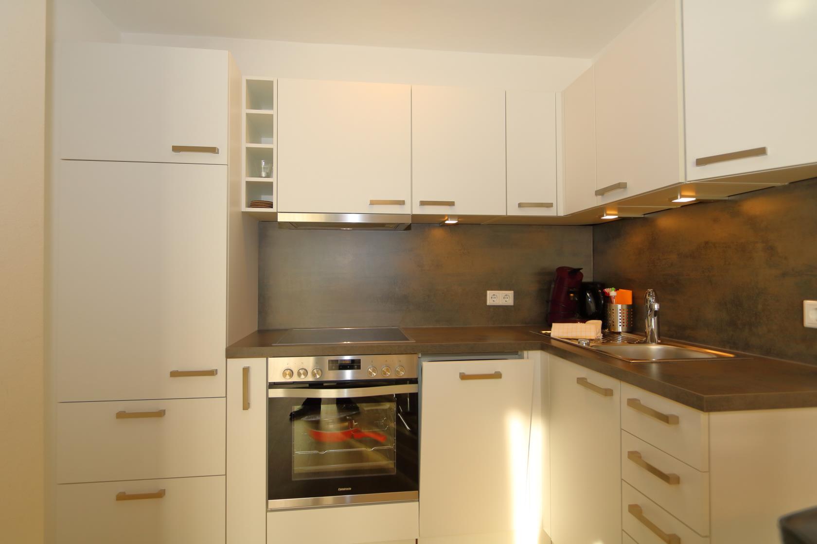 Küche mit Ceranfeld und Backofen, Spülmaschine, Kühlschrank mit Eisfach, Filter-Kaffeemaschine, elektrischer Wasserkocher und Toaster sind selbstverständlich.