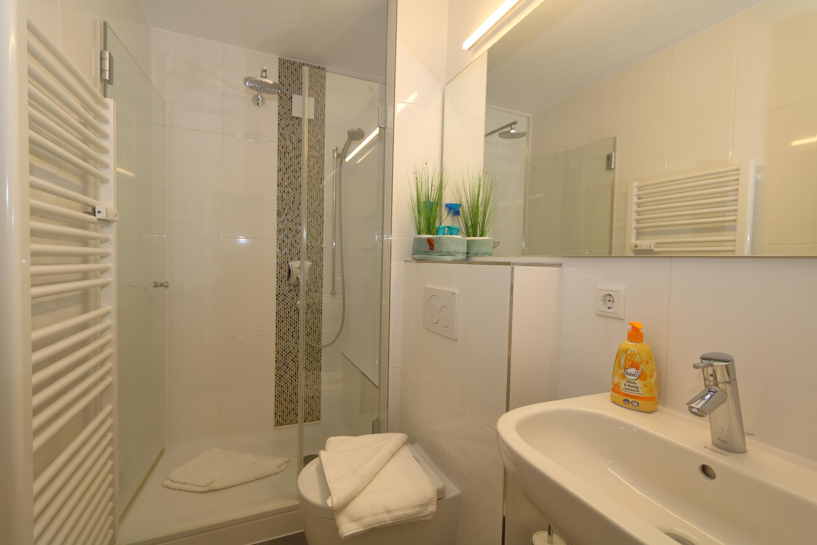 Badezimmer mit Dusche, WC, Waschtisch. Ausreichend Handtücher und Vorleger.