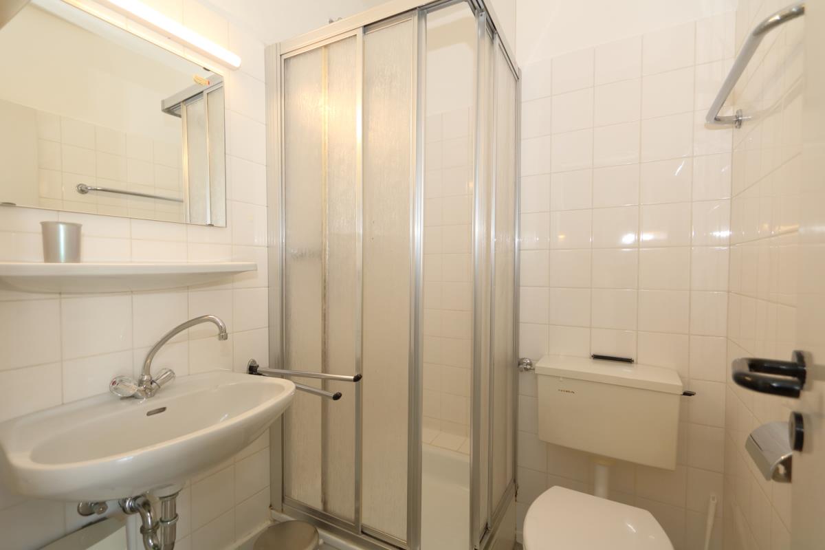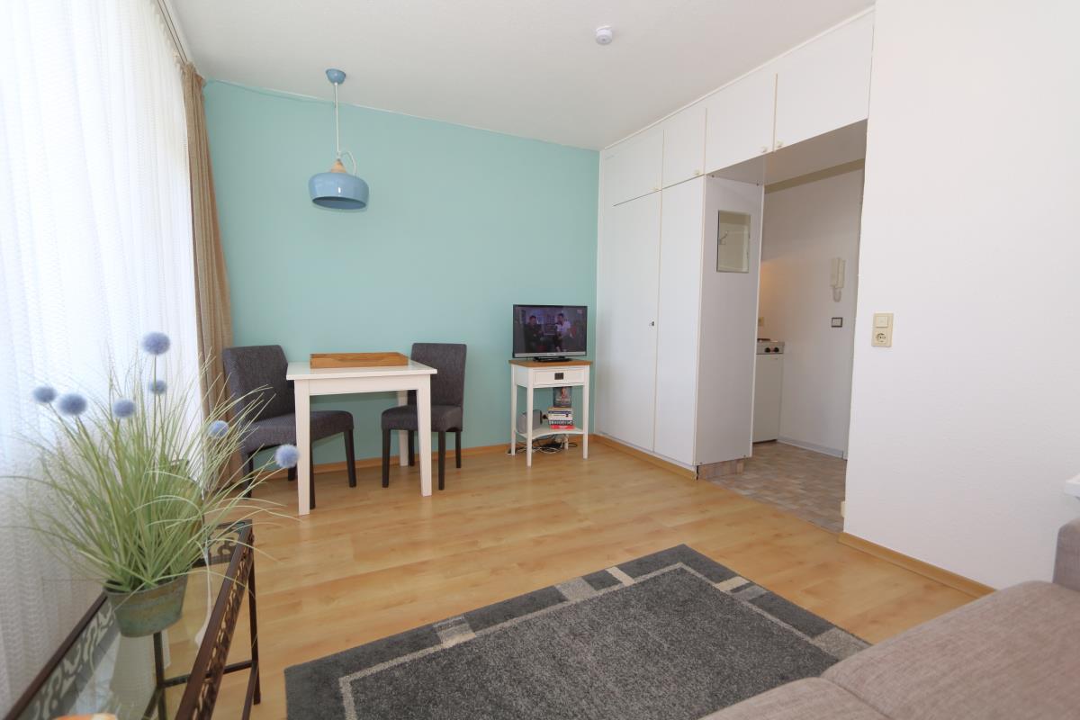Das Wohnzimmer des Appartements ist mit einer Schlafcouch (1,40 m Liegebreite) und dem Essplatz eingerichtet. Auf dem Westbalkon kann man die Nachmittagssonne genießen. Eine kleine Pantryküche bietet entsprechende Möglichkeit zu kochen. Das Bad hat eine Dusche.