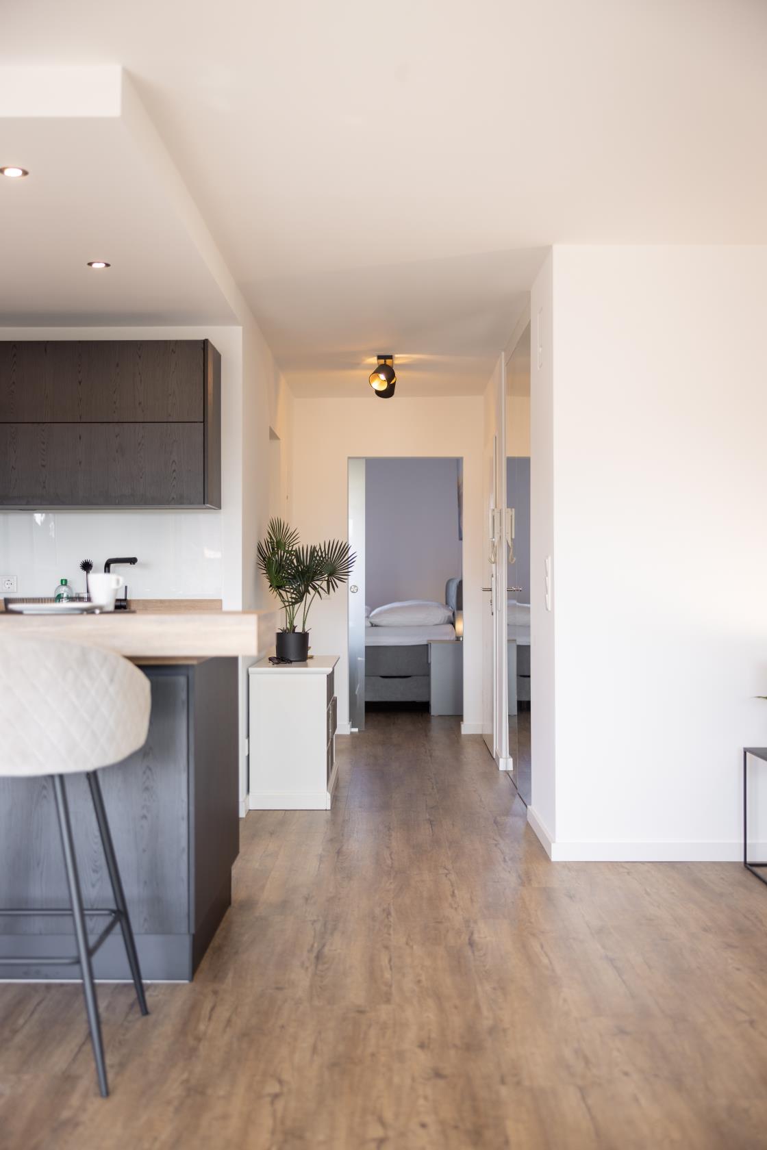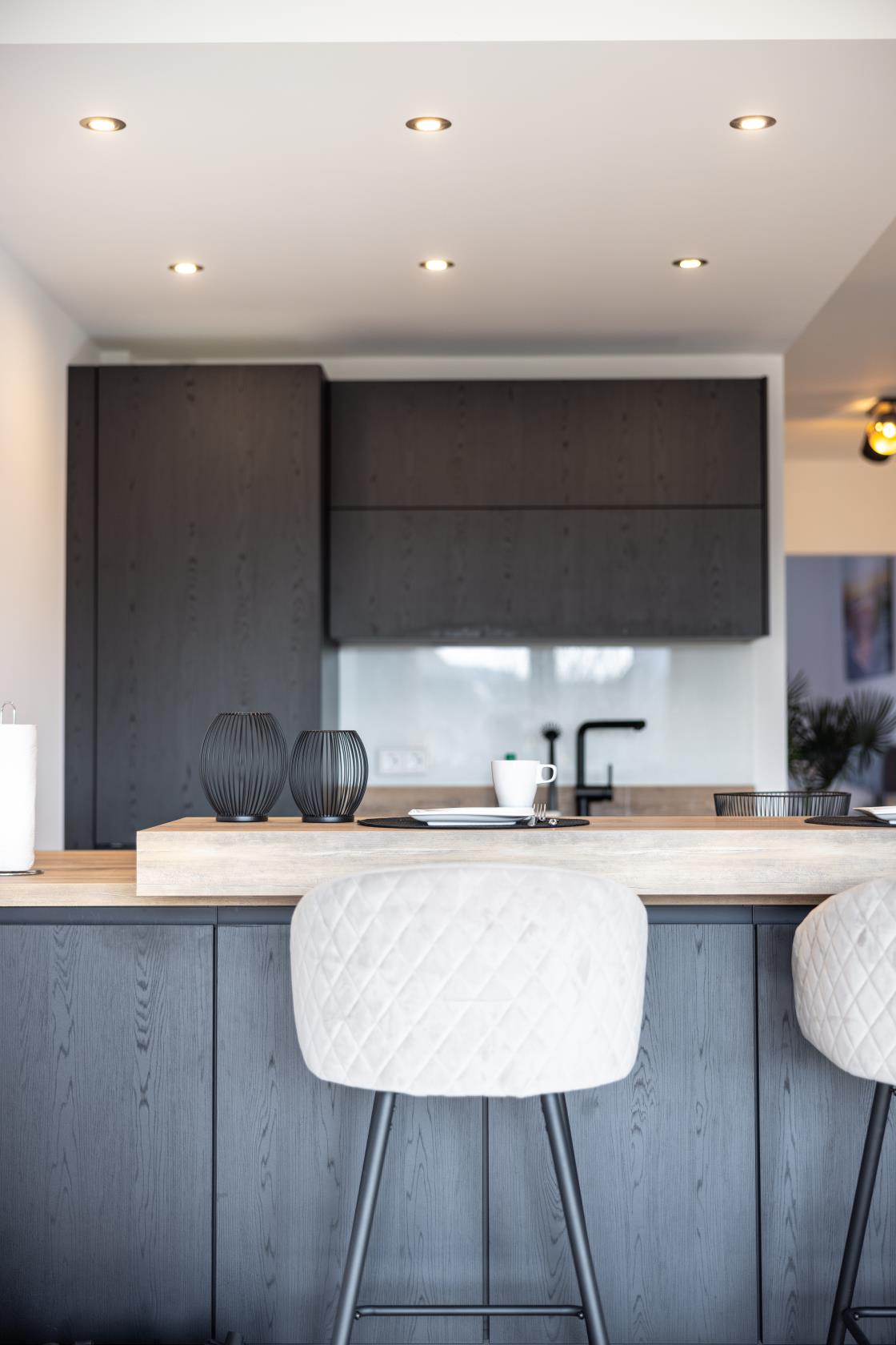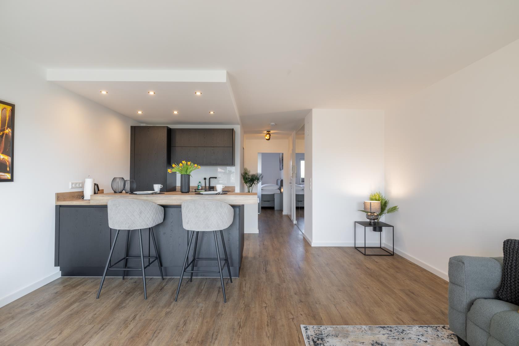 Küche: Offene, voll ausgestattete Küche mit einem hochwertigen Bora Kochfeld, Mikrowelle, Backofen und einem großen Kühlschrank mit Eisfach. Ein gemütlicher Esstresen lädt zu gemeinsamen Mahlzeiten ein.