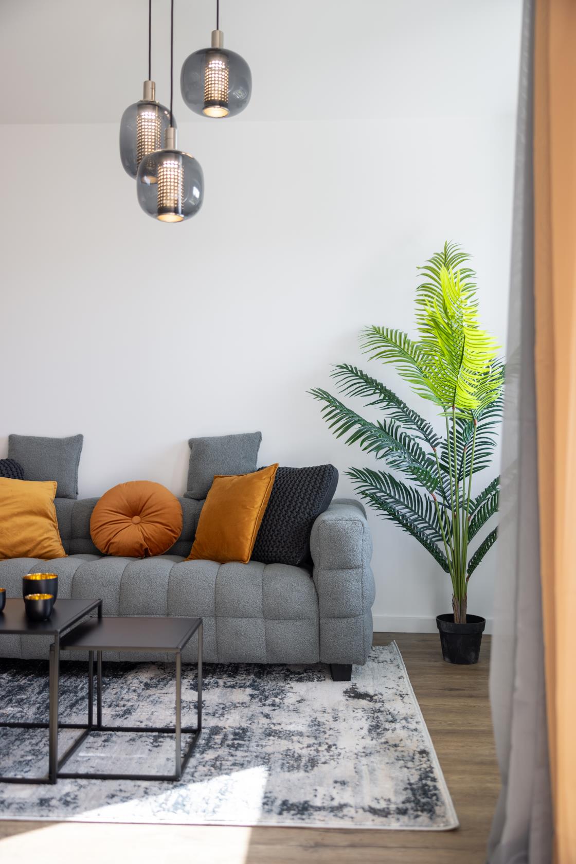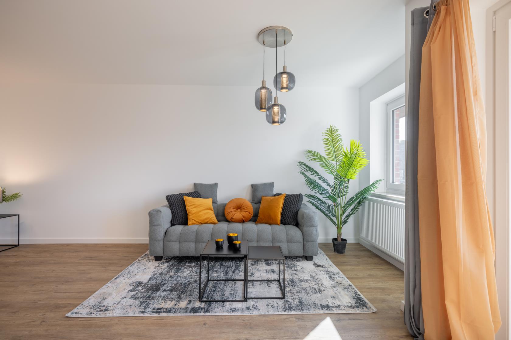 Wohnzimmer: Heller Wohnbereich mit einem großen Smart-TV und einem gemütlichen Sofa, ideal für entspannte Abende.